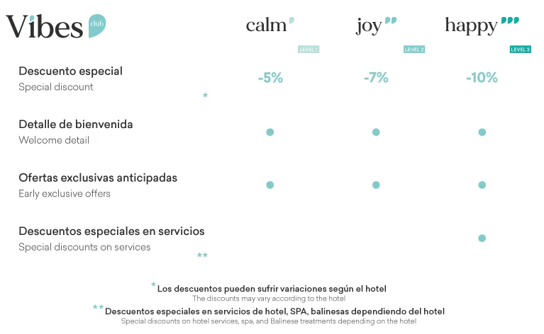 En función de tu nivel de Vibes, disfrutarás de tarifas con descuentos especiales diseñadas exclusivamente para ti. Además, en algunos hoteles podrás acceder a beneficios adicionales que podrás consultar al realizar tu reserva.